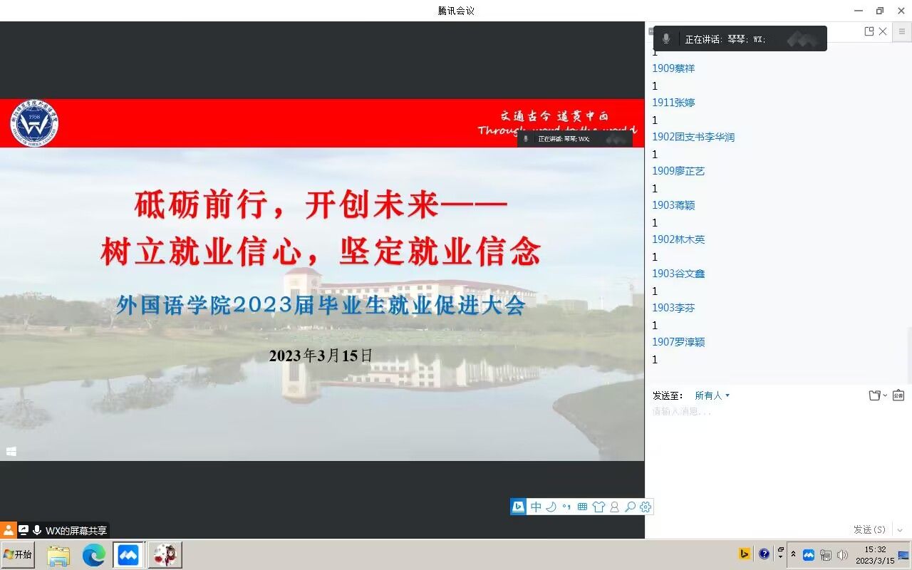 为充分调动毕业生就业积极性,帮助毕业生了解就业形势及就业政策,做好就业指导工作,提高毕业生就业竞争力和就业质量,3月15日下午,我院召开2023届毕业生就业线上促进会。英国365集团党总支书记贺琴琴、副书记欧阳竹、就业专干邱国周以及2023届全体毕业生参加了本次会议,会议由欧阳竹主持。