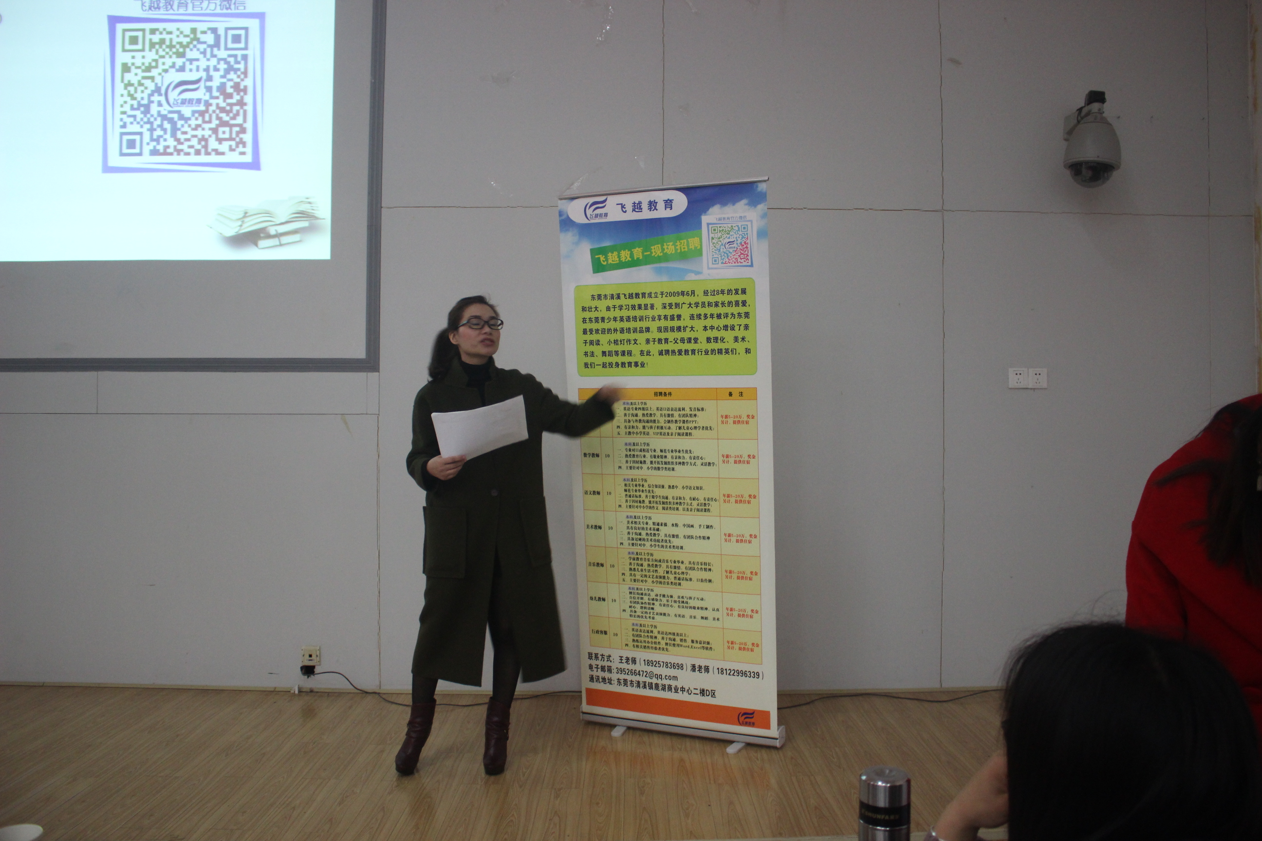 首先,飞越教育招聘负责人王总监简单介绍了一下基本情况。“东莞市清溪飞越教育文化艺术培训中心成立于2009年6月,经过近8年的发展和壮大,由于学习效果显著,深受广大学员和家长的喜爱,在东莞青少年英语培训行业享有盛誉,连续多年被评为东莞最受欢迎的外语培训品牌。现因规模扩大,增设了亲子阅读、小桔灯作文、亲子教育-父母课堂、数学、美术、书法、舞蹈等项目。”