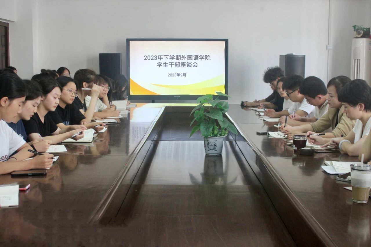 为总结开学以来相关工作,促进学生干部之间的交流,着力打造有作为、敢担当、讲奉献的学生干部队伍,切实提高我院学生管理工作和服务水平,9月25日下午,学院于外语楼南213会议室召开2023年下学期学生干部座谈会。党总支书记贺琴琴、副书记欧阳竹、学工办主任邱国周、辅导员老师龚晨阳、陈琴、刘志伟出席本次会议,院25届学生会、分团委全体学生干部参加会议。会议由欧阳竹主持。