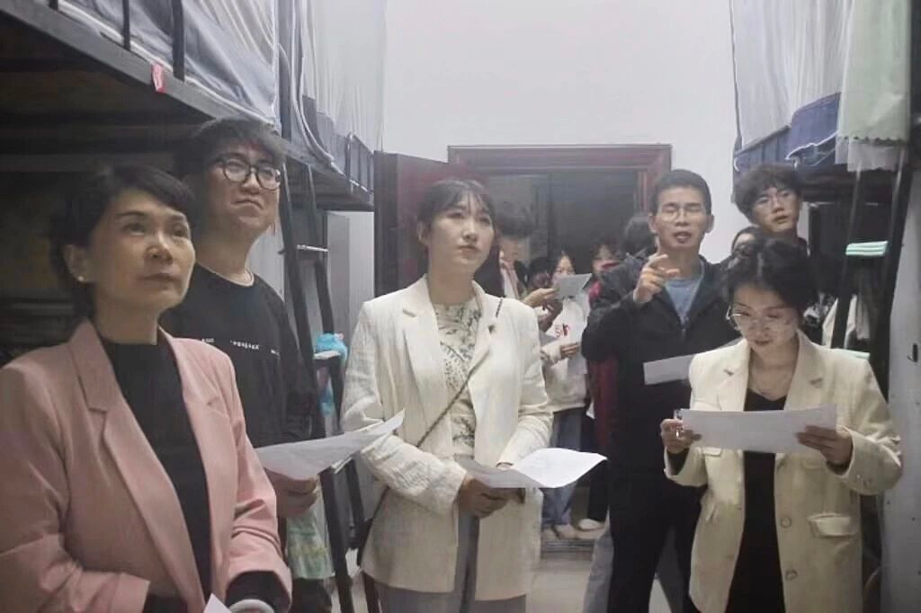 (欧阳竹副书记听参评宿舍讲解员的介绍)