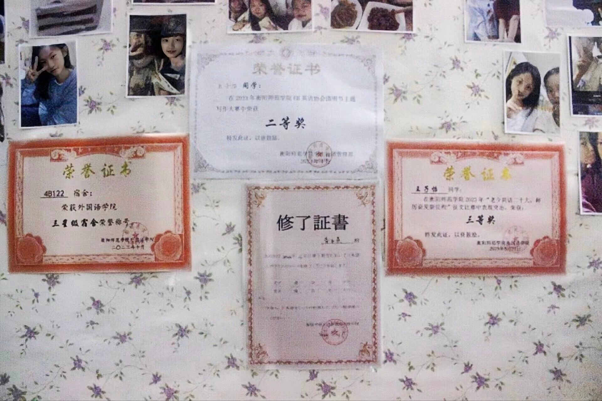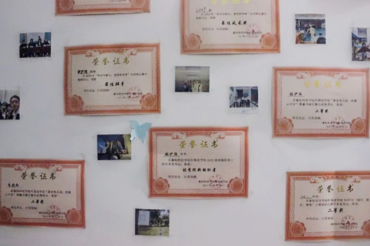 一张张照片错落有致地贴在洁白的墙上,满满的都是寝室的回忆。充满温馨的照片墙和荣誉墙不仅是甜蜜寝室回忆和荣誉的载体,更是寝室团结有爱的最好写照。