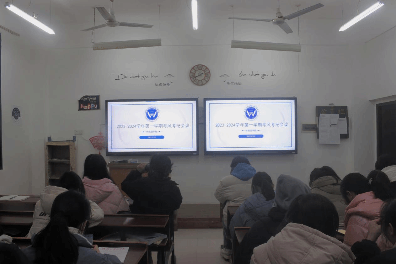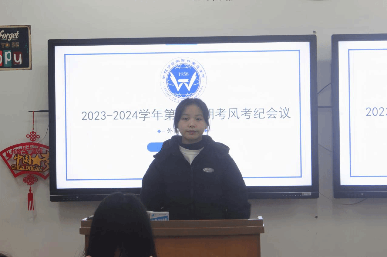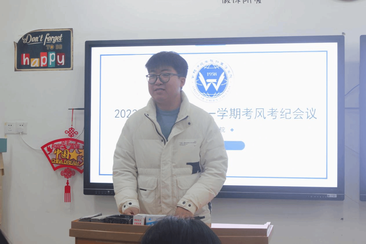 悬衡而知平,设规而知圆。为严肃考风考纪,树立诚信学风,端正考试态度,以积极的心态迎接接下来的期末考试,英国365集团于12月18日晚19:30在外语楼南305教室召开了“严肃考风考纪,争做文明大学生”的考风考纪教育动员大会。辅导员老师刘志伟和2021-2023级各班学习委员共同参会,会议由院学风建设部副部长杨雨欣、张曼主持。