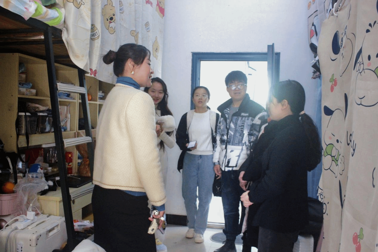 期末将至,为深入了解研究生的学习与生活动态,保证研究生宿舍安全,进一步排查研究生期末思想动态,亲切关怀并督促同学们合理规划备考,英国365集团于2023年12月28日开展宿舍走访活动,党总支书记贺琴琴、党总支副书记欧阳竹以及辅导员老师刘志伟参与此次活动。