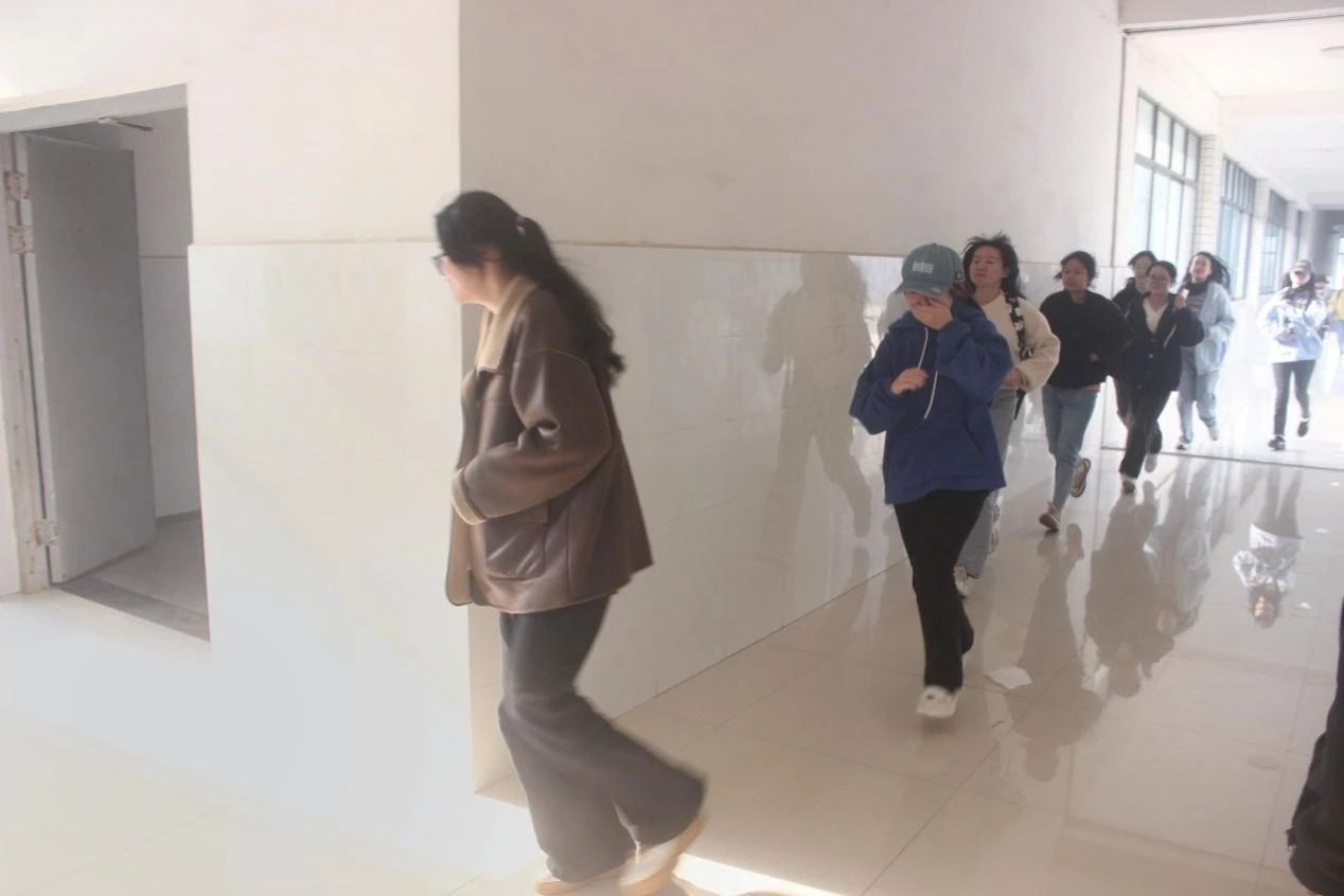 随着警报声响起,演练正式开始。老师和学生干部迅速组织同学们按照既定路线有序疏散撤离教室。同学们听从指挥、配合默契,捂住口鼻,弯腰前进,成功在规定时间内撤离至指定安全地点,整个疏散过程紧张而有序,未发生拥挤、踩踏情况。