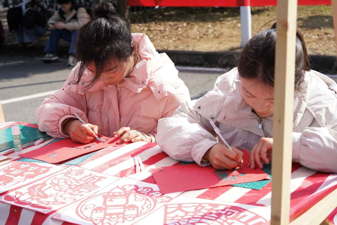 活动现场,非遗工艺品琳琅满目,传统文化氛围浓郁,吸引了全院师生的广泛关注与积极参与。美术学院2023级研究生、剪纸非遗传承人王嘉鑫在活动现场为同学们带来了生动的剪纸艺术讲解。作为剪纸艺术的青年传承人,王嘉鑫一直致力于推广并创新这一传统技艺。在他的指导下,同学们积极参与剪纸创作,活动现场气氛热烈。剪纸艺术的细腻精巧,让同学们在实践中深刻体会到了传统技艺的精妙与匠心精神。
