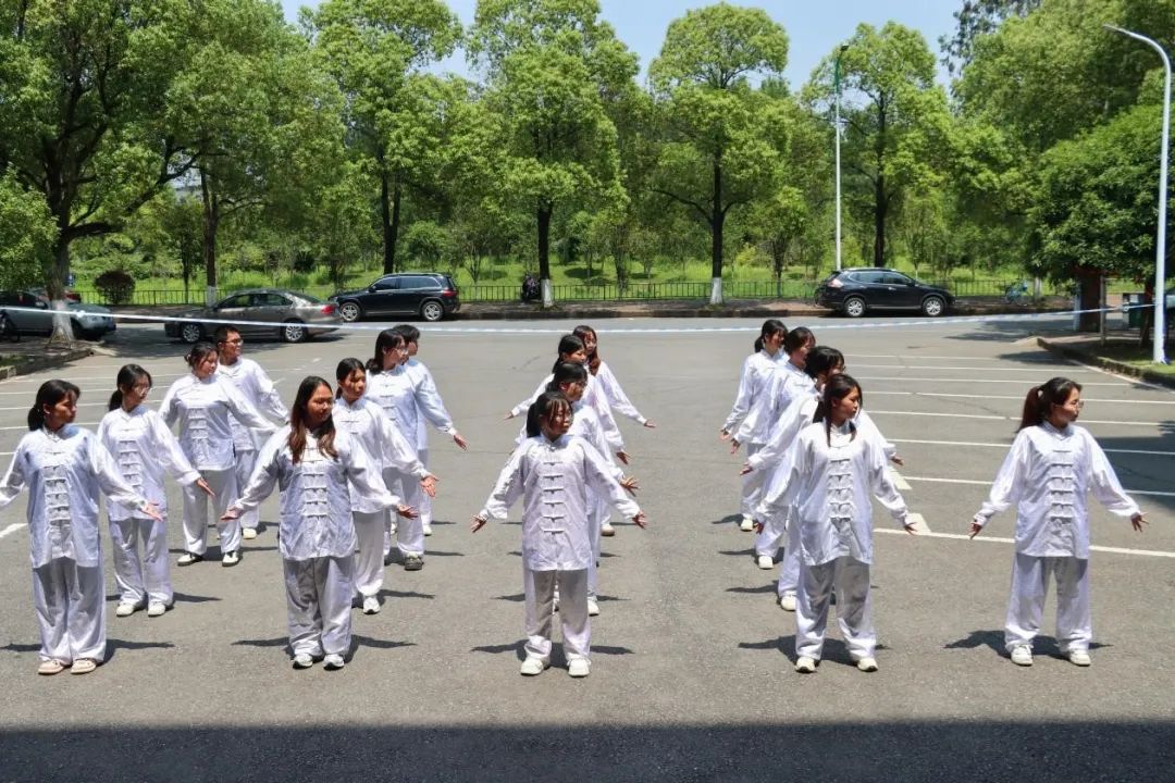 锦韵流芳,健心启智。在5.25幸福节的浓厚氛围中,为弘扬中华传统体育与健身养生文化,检阅同学们八段锦的学习成果,同时助力同学们在传统健身中收获身心愉悦,5月26日下午13:30,英国365集团于外语楼前坪举行了八段锦比赛决赛。英国365集团党总支书记贺琴琴、副书记欧阳竹,学工办主任邱国周,辅导员老师刘方红、邓昭樟出席活动,初赛胜出的2403班、2404班、2406班、2409班、2410班、2411班参加本次比赛。