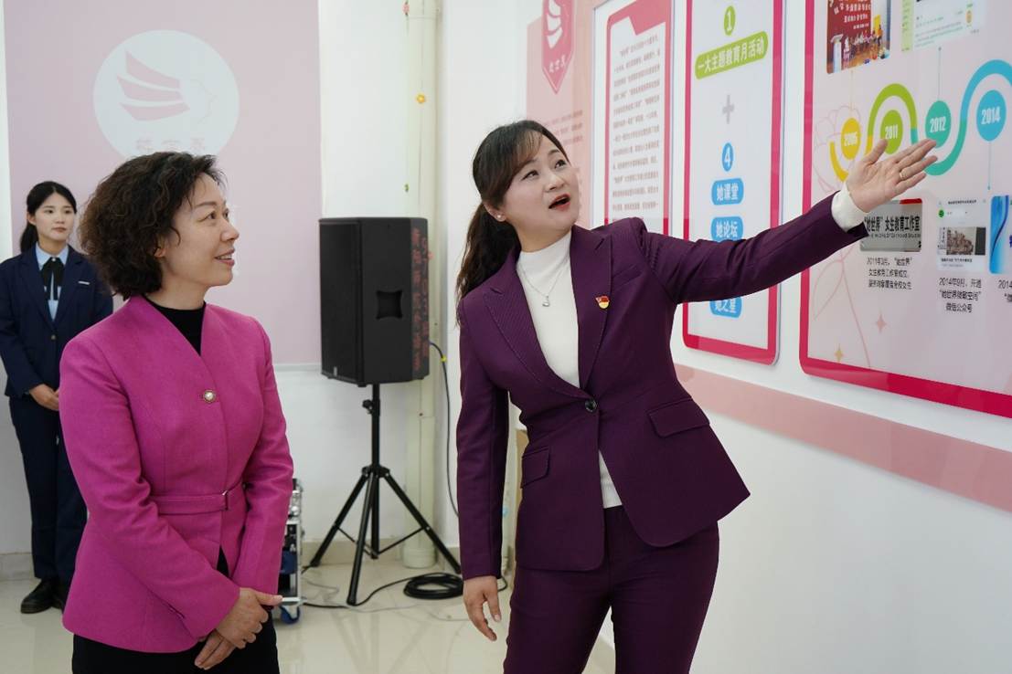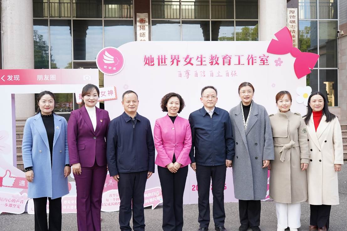 (湖南省妇联党组书记、主席杨兰英来“她世界”女生教育工作室调研(左四杨兰英,左五:校党委书记刘子兰,左三:校党委副书记陈敏,左七:校党委委员、组织部部长唐艳))