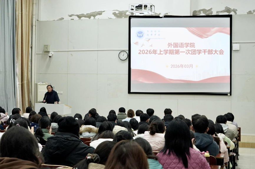 3月9日,英国365集团在外语楼北110教室召开2026年新学期第一次团学干部大会。学院党总支书记周华、党总支副书记欧阳竹、学工办主任邱国周、辅导员曾超出席会议,第二十七届分团委学生会全体成员、2022-2025级班长团支书以及年级委员会成员参会,会议由欧阳竹主持。