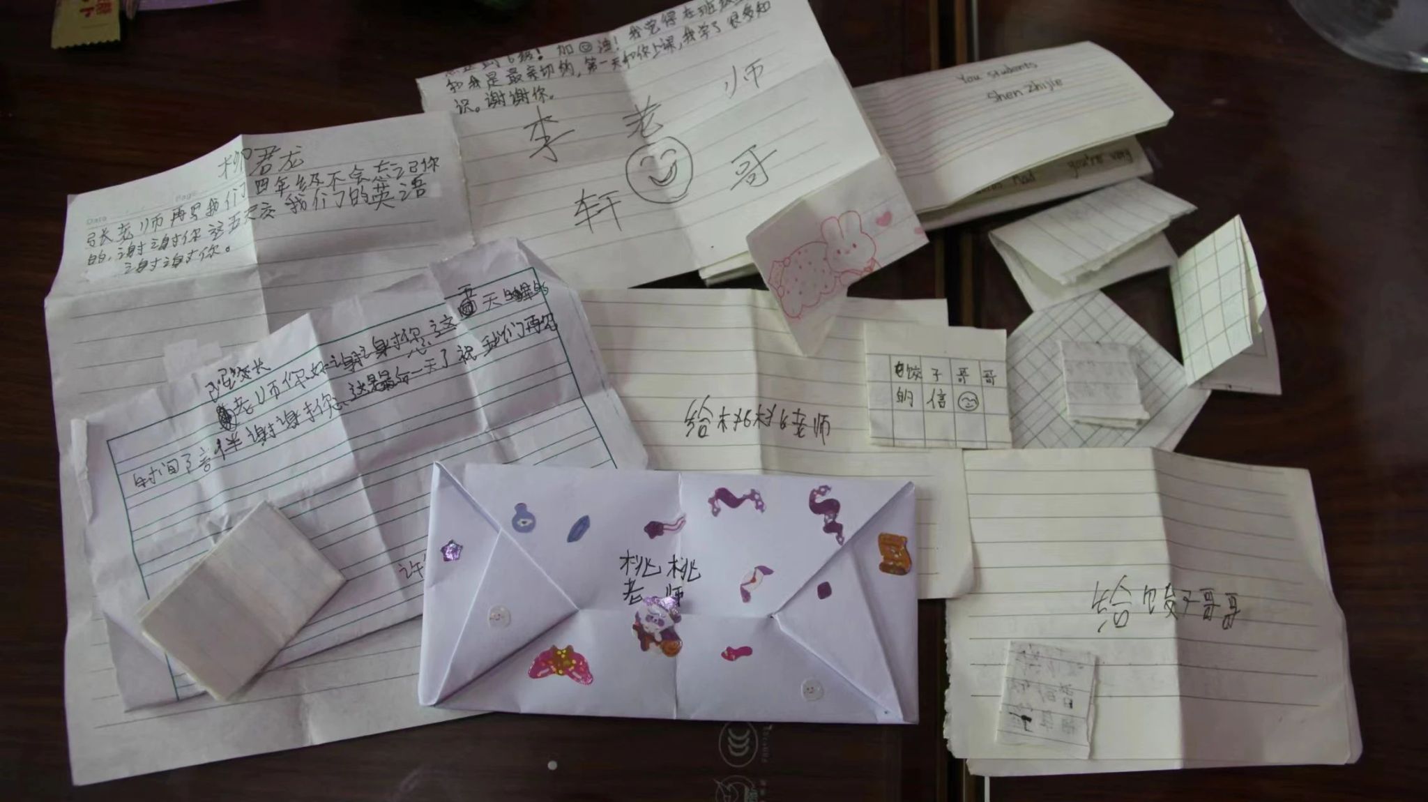 在临别之际,可爱的小朋友们为志愿者手写下一封封告别信。工整的字迹,有趣的涂鸦,精致的信封,都生动体现了师生间的美好感情。