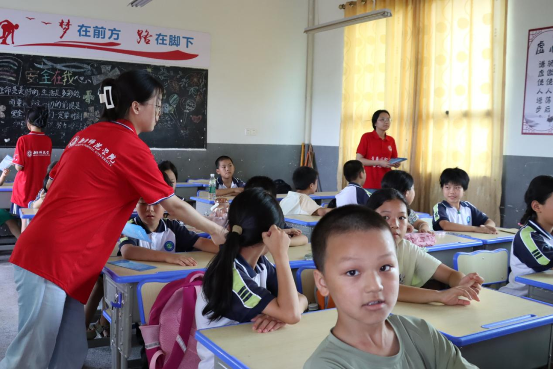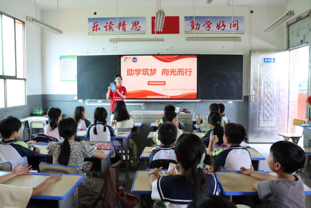 在农村地区,资助政策的广泛宣传和有效实施,对于促进教育公平、推动乡村振兴等方面具有不可忽视的积极作用。因此,志愿团走进明德小学,通过定点宣传、主题班会宣讲的形式为同学们发放学生资助政策宣传手册,并耐心地讲解国家资助政策的相关内容。队员们鼓励学生们努力学习,争取接受更高层次的教育,激励家庭经济困难的同学自立自信、奋发图强,提高自身综合能力,将来反哺家乡,为乡村振兴发展推波助澜。