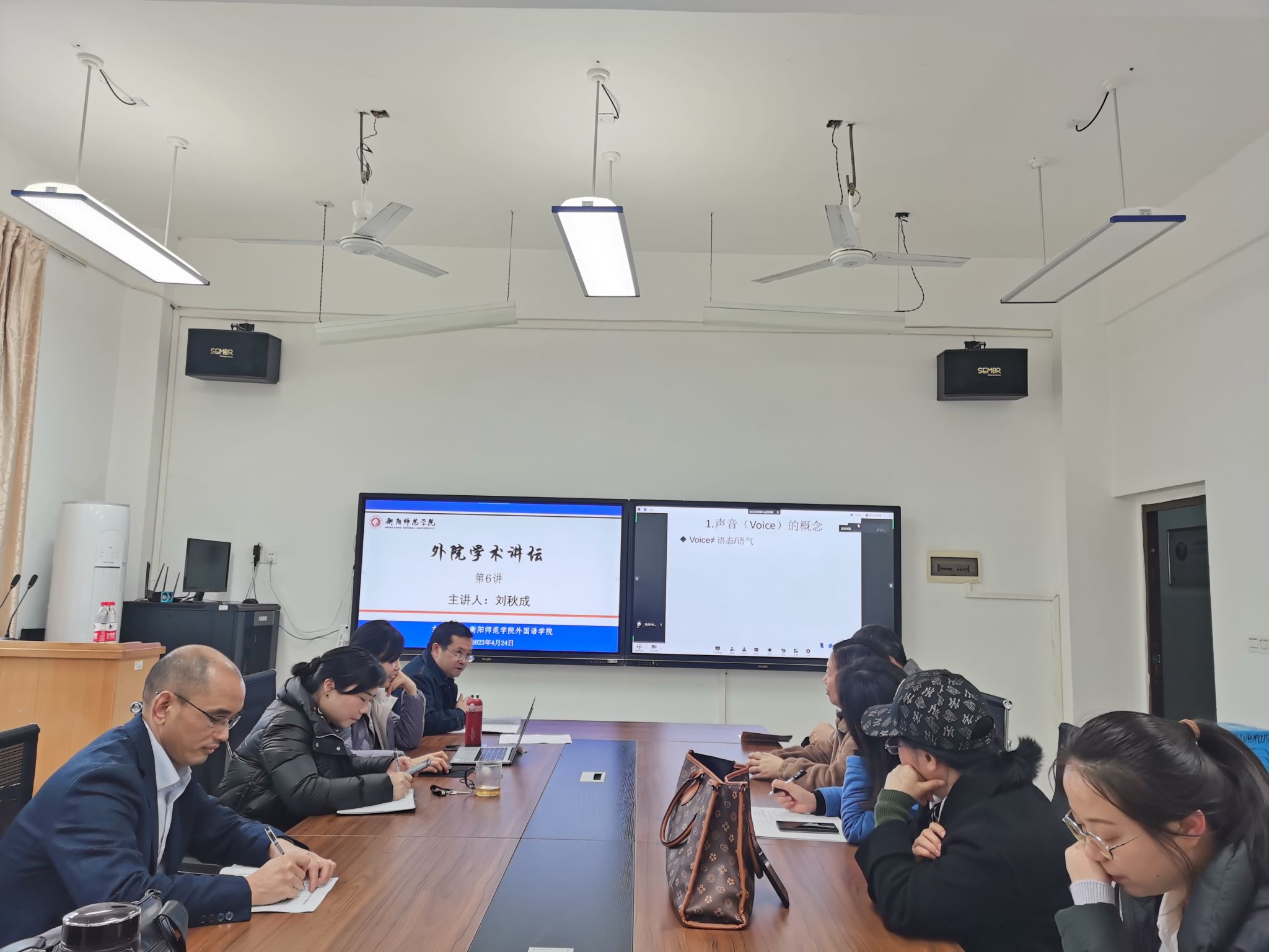 2023年4月24日下午英国365集团2023年上学期学术讲坛系列活动第6讲在外语楼南311研究生会议室举行。刘秋成老师为我院教师作了一场题目为《二语学术写作中的声音构建研究:回顾和展望》的学术报告。讲座由邬德平博士主持,我院刘剑院长、何文娟副院长以及英语系、翻译系和商务英语系的部分教师参加了本次讲座。