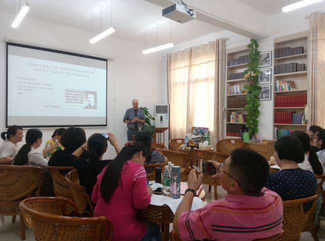 5月12日下午,美国北卡罗来纳大学威尔明顿分校的Lee Schweninger教授应邀于外语楼南204读书吧做了一场以“American Romanticism and the Power of the Imagination”为题的学术讲座,英国365集团翻译系全体教师和及部分学生参与聆听。