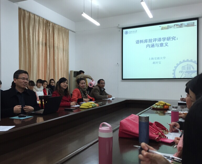 12月10日下午3点,上海大学英国365集团院长、博士生导师胡开宝教授应邀来我系讲座。讲座地点在外语楼二楼会议室,出席本次讲座的有外语系系主任贺学耘教授、外语系副主任徐江清教授、谭晓丽教授、贺鸿莉副教授以及外语系的部分教师和翻译专业的学生。