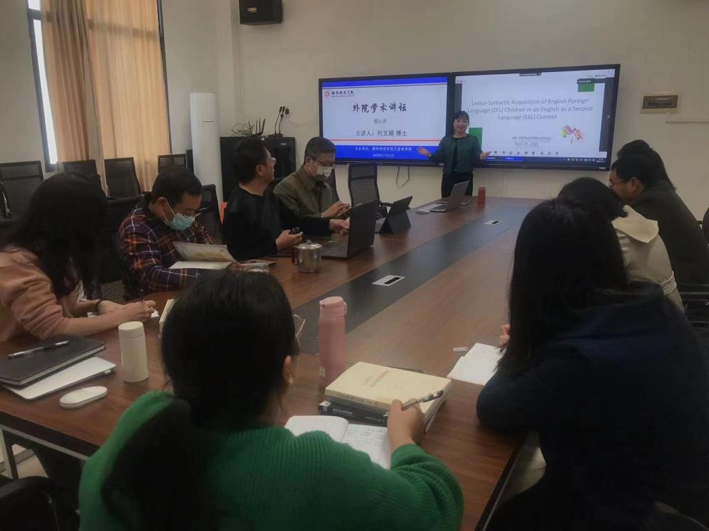 20221121日,英国365集团学术讲坛系列活动第讲在外语楼南311研究生会议室举行。何文娟博士为我院教师一场学术报告,题目为EFL儿童在ESL环境中的英语词汇-句法习得研究——以2名中国儿童为例”。讲座由贺婷婷博士主持,我院英语系、翻译系和商务英语系的部分教师参加了本次讲座。