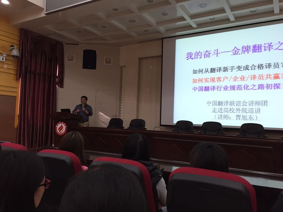 2014年11月3日下午3点,翻译界两位翘楚来我系讲学,他们分别是曹旭东先生和萧奇女士。曹先生是国际商务联盟总部秘书长、中国翻译联谊会创始人兼秘书长、译合品牌创始人、译无止境品牌创始人,具有20年石油行业工作经验、2000万字石油专业资料翻译及审校经验。萧女士是澳大利亚悉尼大学医学院临床研究生、在读博士、职业同传译员;中国翻译联谊会常务副秘书长兼澳洲总干事。兼职客座国外高校和培训机构如新南威尔士大学、新加坡管理大学等。澳洲国家翻译传译认证局高级职业传译员(中英双向)。澳大利亚现任总理阿博特(Mr. Tony Abbott)保密项目专职翻译。传译经历包括在中国、新加坡、澳大利亚等国家召开的国际会议高层会晤中作为州长、上议院主席、资源部长、工业部长、医学界国际权威、中澳商务参赞等的私人翻译;作为国内数家大型企业对外投资项目的首席翻译,负责高层接洽和商务谈判等;参与中澳两国国防保密项目翻译工作;担任亚太区国际会议中英组同声传译员。作为医学与英语学科交叉人才,具有丰富的国际医学会议同传交传经验。视野丰富,风趣幽默,常受邀在国内重点高校巡回讲座,深受师生欢迎。