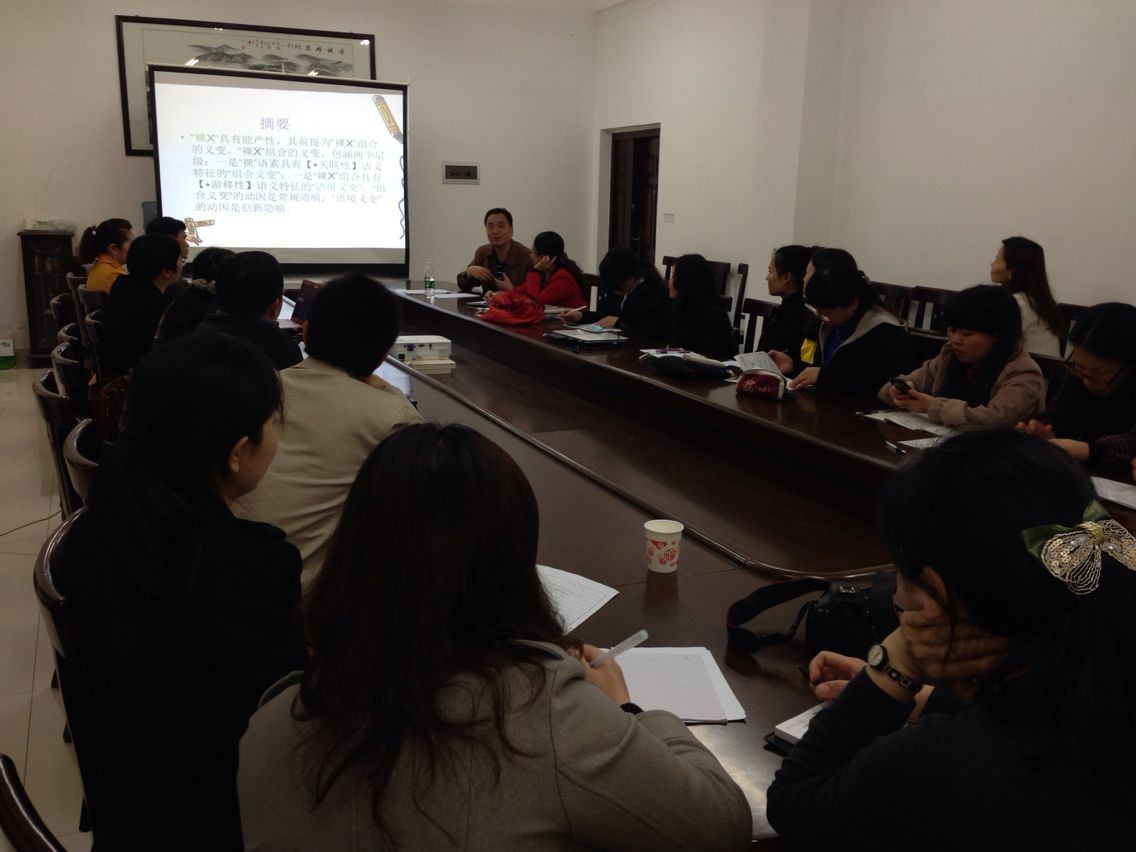 首先,语言学教研室的肖素英副教授做了个简短的学术讲座,讲座的题目是:双音节偏正式“裸X”组合的义变及其动因。肖老师认为“裸X”的能产性是以“裸X”组合的义变为前提的;“裸X”组合的义变由两个层级组成,一是“裸”语素具有【+关联性】语义特征的“组合义变”,二是“裸X”组合具有【+游移性】语义特征的“语境义变”;“组合义变”的动因是常规隐喻,“语境义变”的动因是创新隐喻。
