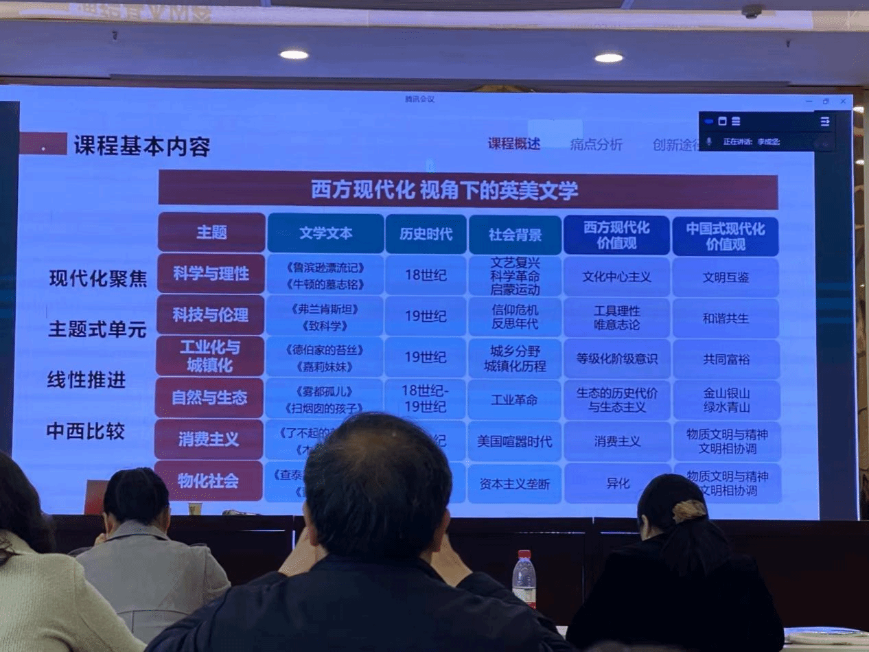 李成坚教授提出,这既是挑战也是必须迎接的任务。李教授以她的一门通识课程《西方现代化视角下的英美文学》为例,向大家展示了如何应对信息化应用改革,如何通过混合式教学模式促进课程高质量发展。李教授还指出,通识教育要注重“打底色”、“价值塑造”和“”通专人才的培养”。外语学科支撑下的通识课程需要重建教学内容,从外语学科专业中提炼通识元素,突出国际视野。课程建设要以新文科为理念,强调“知识融通”、丰盈“中国元素”、强化“中西比较”、促进“人文素养培养和课程思政”。