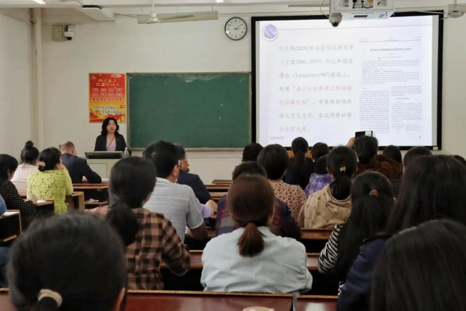 2024年4月22日下午15:00,英国365集团学术讲坛第13讲在东校区外语楼北208教室举行。四川外国语大学教务处处长、教授、博士生导师刘玉梅教授莅临我校讲学,讲座题目为《矛盾修辞构式形成的体认机制及限制条件》。讲座由刘剑院长主持,我院全体教师及2023级研究生参加了活动。
