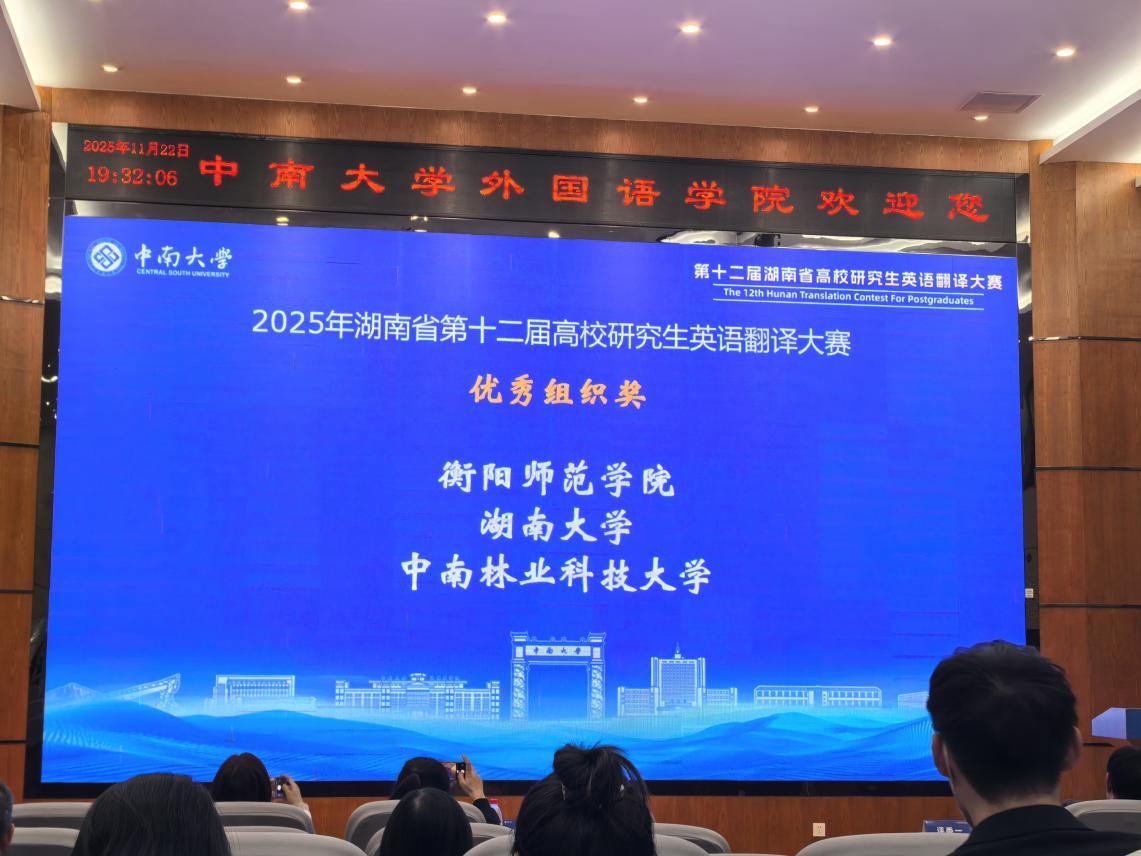 2025 年 11 月 22 日,由湖南省教育厅主办、中南大学承办的第十二届湖南省高校研究生英语翻译大赛圆满落幕。我院研究生学子在赛事中斩获佳绩,充分彰显了我院学子的专业素养与青春风采。