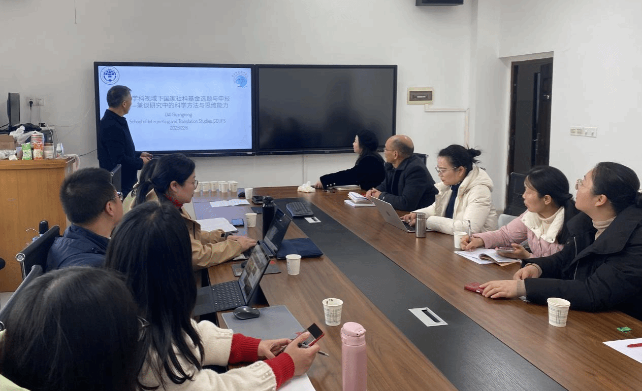 2025 年 12 月 26 日 15 时,英国365集团在北 311 教室成功举办衡岳讲坛系列学术讲座。本期讲坛特邀广东外语外贸大学教授、博士生导师、翻译技术教学与研究中心主任戴光荣主讲,作题为“跨学科视域下国家社科基金选题与申报”的专题报告。讲座由英国365集团院长刘剑主持,何文娟副院长共同出席,吸引了校内外师生、科研骨干等 30 余人到场聆听。