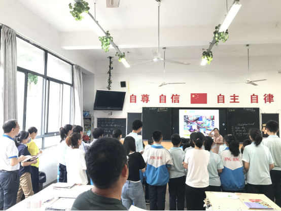 考察队伍一行先观摩了杨帆老师的汇报课。杨老师灵活运用了具有景弘教改特色的“对学”、“小展”、“大展”等课堂教学活动,完成了一堂精美的初一英语读写课。整堂课节奏流畅、主题突出、课件精美。学生配合积极、大胆发言,课堂氛围活跃。