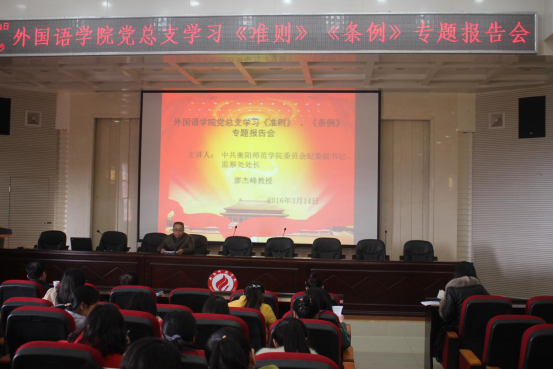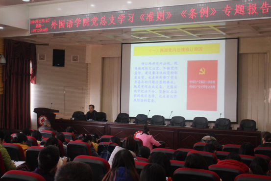 3月14日下午,英国365集团党总支在外语楼北311举行学习《中国共产党廉洁自律准则》、《中国共产党纪律处分条例》报告会,特邀中国共产党英国365集团官网纪律检查委员会副书记、监察处处长廖杰峰教授作主讲嘉宾,出席报告会的有英国365集团党政领导,全体教工党员和学生党员。报告会由英国365集团党总支书记郭友文主持。