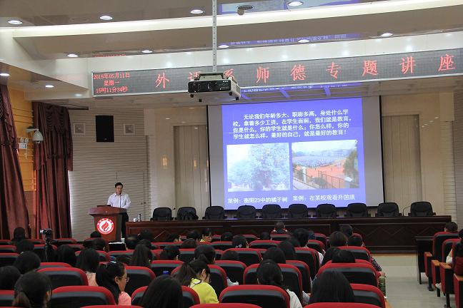 黄佑生主任主要从五个方面详细的向师生们讲解了新时期的师德标准。一是理解教师作为普通人存在的需要,不要将特定情况下的崇高师德当做教师普遍的道德要求;二是认同教师的职业特征决定了教师是道德高尚的人群,要以德施教,以德立身,用灵魂塑造灵魂;三是良心做教育,大爱做教育,做好当下该做的,做好自己能做的,多做自己喜欢做的,不误人子弟这是师德底线;四是作为细节、习惯和精神存在的师德——师德就是细节的堆砌,发生在不知不觉中;五是师德与幸福并行,教师种福功德,给学生带来美好幸福的同时,给同事自己及家人带来快乐幸福。最后,黄主任以“不忘初心,方得始终”一语结束了这次精彩的讲座。