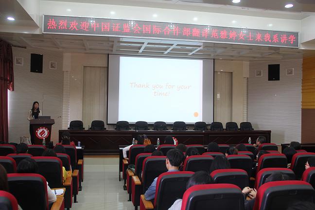 3月29日下午外语楼311多媒体报告厅座无虚席,我系邀请中国证监会国际合作部翻译范雅婷女士和香港海达仪器有限公司董事长钟凤娇女士来我系讲座。系党总支书记郭友文、系主任贺学耘以及系部专业教师朱艳宁、李娟等出席了此次讲座。商务与翻译专业的部分学生聆听了讲座。