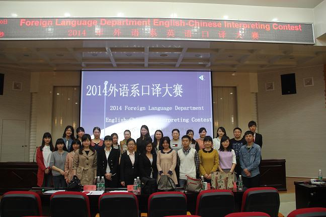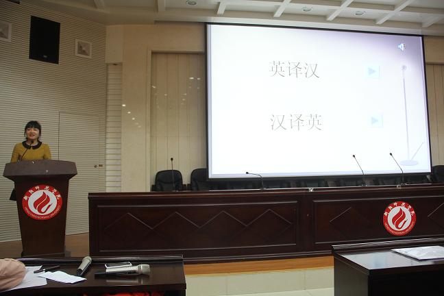 3月30日上午,我系商务英语教研室和翻译教研室联合在外语楼北311举办了2014年外语系英语口译大赛的决赛。外语系党总支郭友文书记、贺学耘主任、何芳副书记、徐江清副主任、贺鸿莉副主任以及商务英语教研室主任朱艳宁和翻译教研室主任吕凌云老师作为嘉宾出席了本次大赛,中国证监会国际合作部翻译范雅婷女士以及外语系部分口译任课教师应邀担任评委。