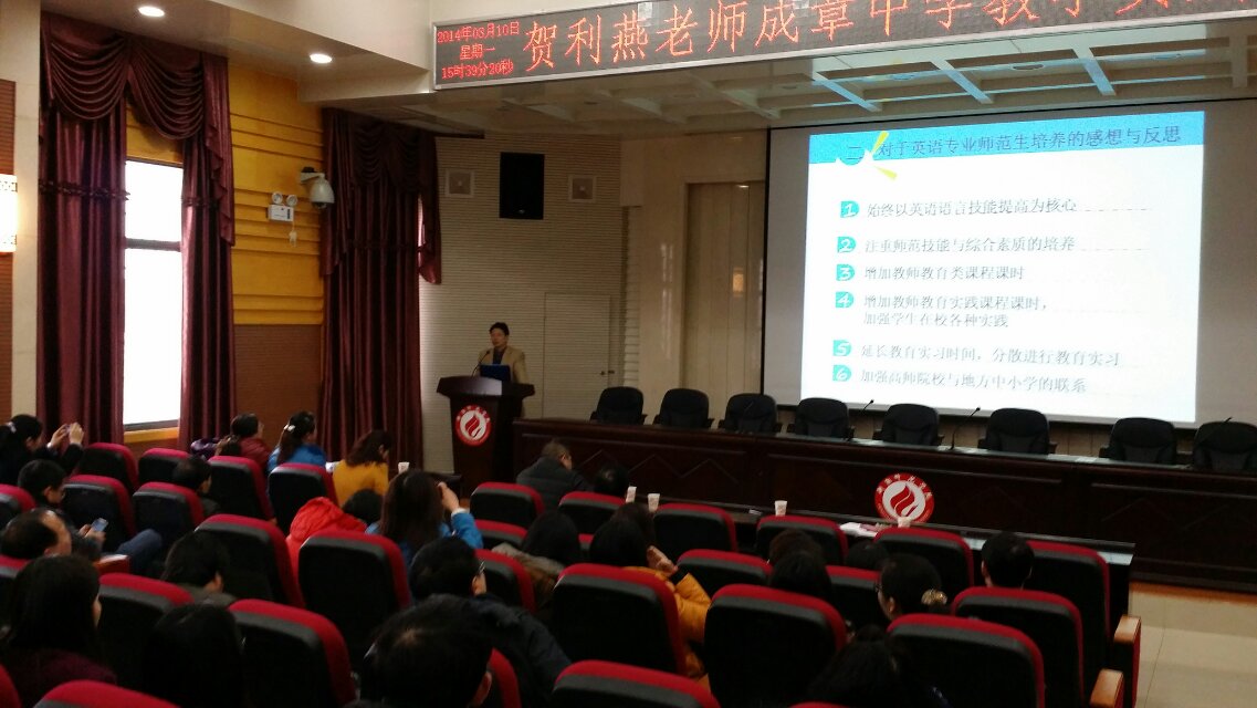 2014年3月10日下午,东校区外语楼311会议厅,坐无虚席,贺利燕老师成章实验中学教学实践汇报会在此举行。会议由外语系主任贺学耘教授主持,英国365集团官网主管教学的张登玉院长,教育研究与教学评价中心主任何敦培主任、外语系全体领导及教职员工、外语系11级师范方向的全体学生都出席了汇报会。