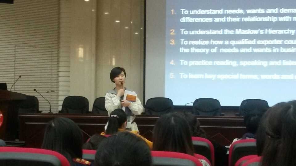 李睿教师授课的课程是《商务英语》中的Unit 2 “Needs and Wants”。李老师英语口语发音纯正,课件设计精美,整个课程设计逻辑清晰,从大家的日常生活需求出发导入到市场营销中的马斯洛需求层次理论,运用大量生动的图片,结合全球著名公司的案例向学生讲解了马斯洛理论中的五个需求层次,以及出口商是如何运用这个理论来进行市场营销的。