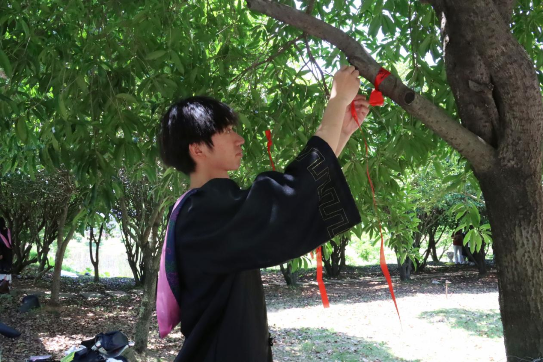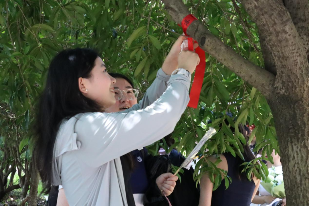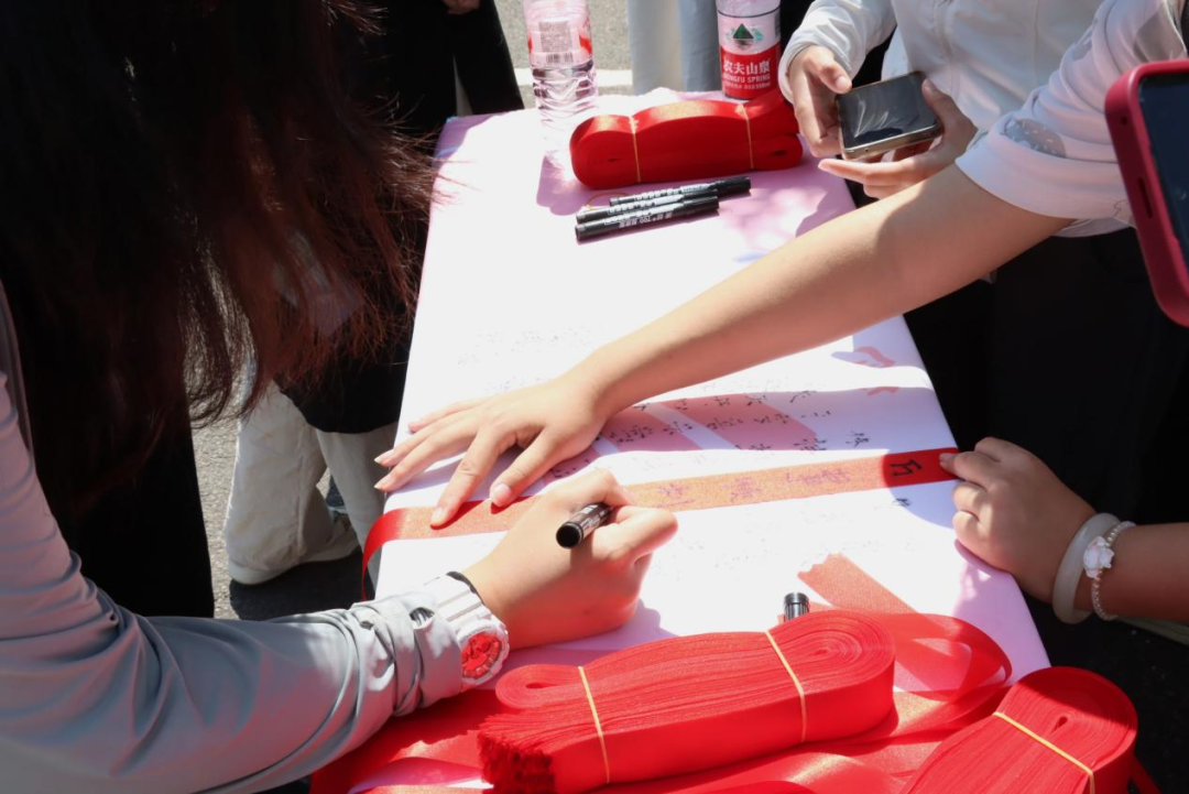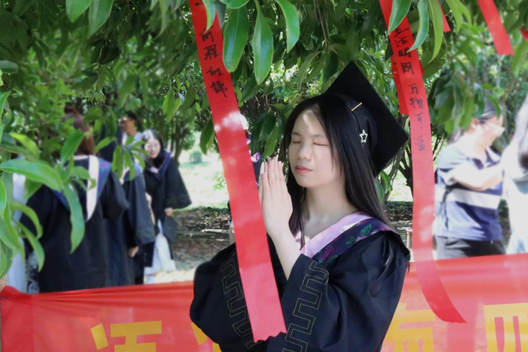 活动现场,毕业的喜悦与离别的不舍交织,处处洋溢着温馨热烈的氛围。在“祈愿折桂寄期许”活动中,志愿者为毕业生们发放许愿布条,毕业生们纷纷拿起笔,在许愿布条上写下自己对未来的美好期许,以及对母校和同窗的祝福。一条条许愿布条在微风中摇曳,成为校园里一道充满希望与梦想的风景线。