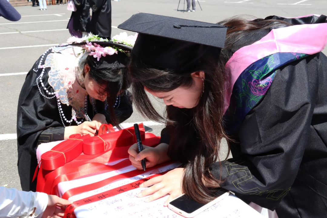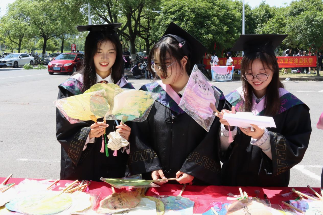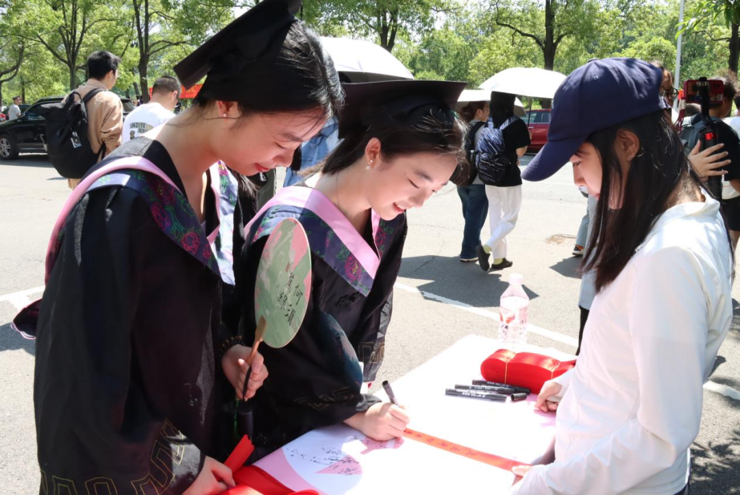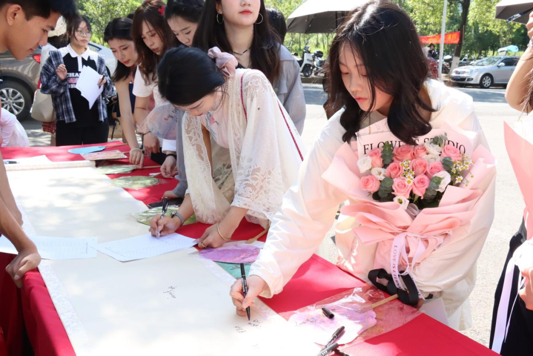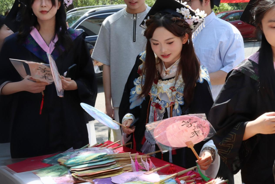 在“漆扇留韵致青春”活动中,志愿者们热情地将绘有“前程似锦”“扬帆启航”等美好寄语的漆扇送到毕业生手中,毕业生还可选择为漆扇加盖纪念章,增添仪式感。在“署名待长存印记”签字活动中,一旁的纪念卷轴徐徐展开,毕业生们在此挥毫签名、书写祝愿,每一笔都凝结着青春印记与未来期许。