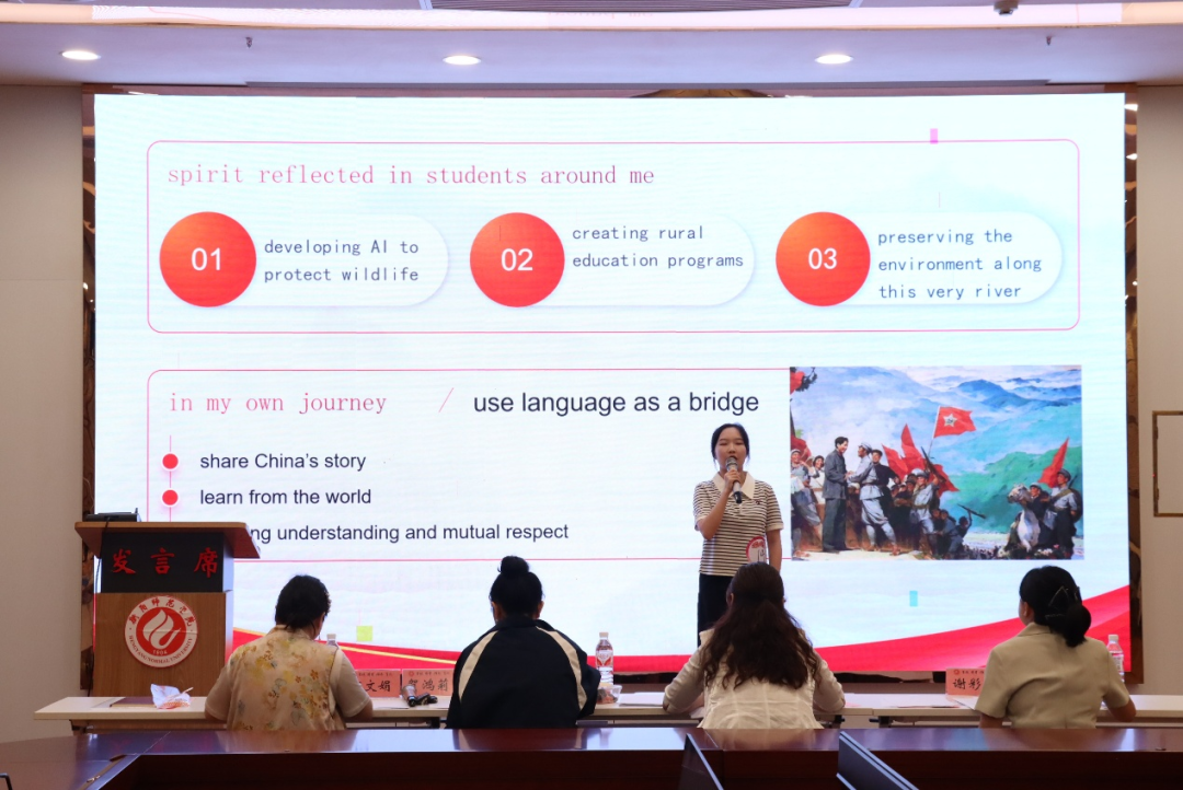 决赛现场气氛热烈,选手们自信从容,紧扣“时代浪潮下的我与中国”主题,以流利英语讲述中国故事。有的选手以乡村支教的亲身经历,展现青年扎根基层、无私奉献的担当精神;有的选手通过家乡道路、社区环境的巨大变化,折射出中国发展的磅礴力量;还有选手以家族的三代传承——从革命军人的湖湘精神,到工程师父亲的建设担当,再到自身的育人志向,诠释时代变迁中一脉相承的家国情怀。一个个真实故事引发全场共鸣,掌声不断。在提问互动环节,评委们结合选手的演讲内容,提出了一个个兼具深度和现实意义的问题,选手们从容应答,展现出新时代青年的思辨能力和责任担当。