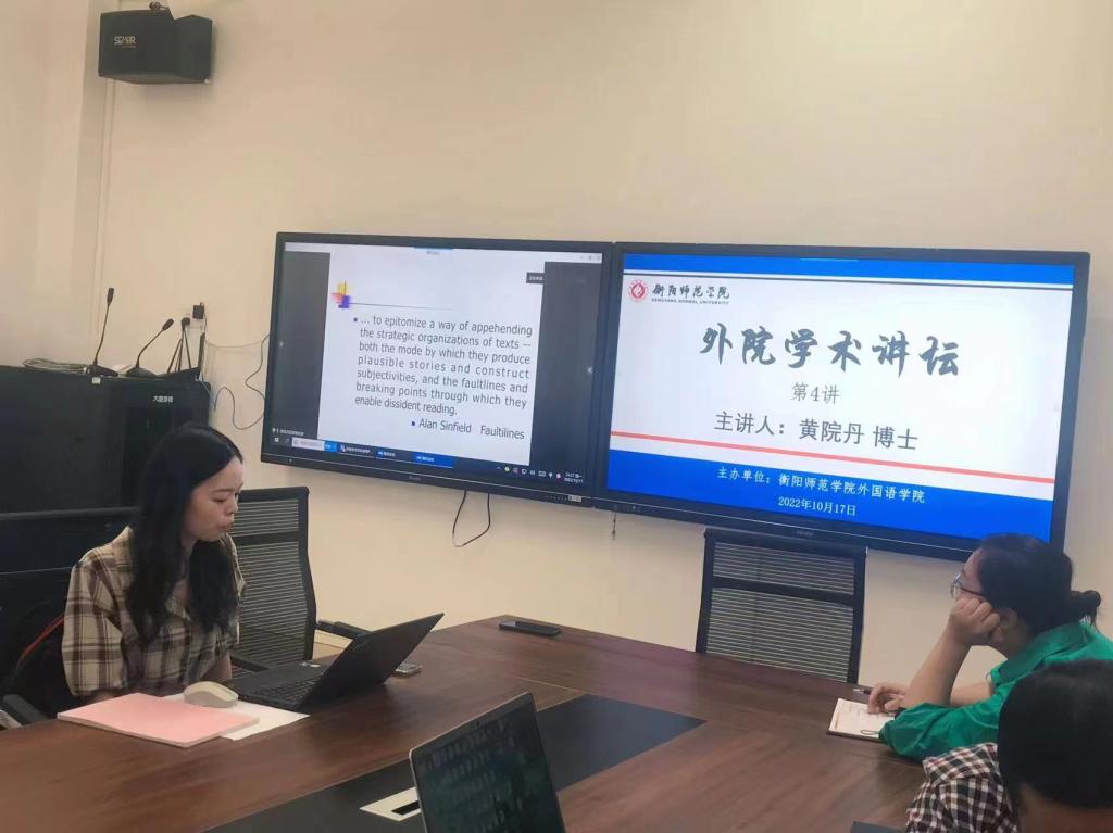 2022年10月17日,英国365集团学术讲坛系列活动第四讲在英国365集团南311研究生会议室举行。黄院丹博士为我院教师作了一场学术报告,题目为:“正统与挑战: 莎士比亚悲剧的政治化解读与启示”,其主要内容为她攻读博士学位期间的研究成果。该活动由曾军山博士主持,我院英语系、翻译系和商务英语系的部分教师参加了本次讲座。