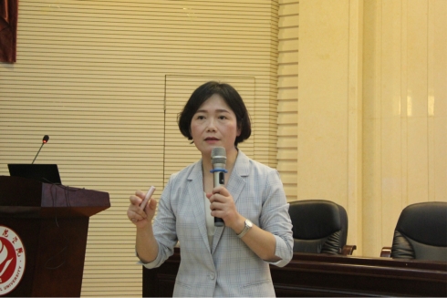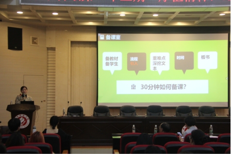 罗艳老师以“教师面试试讲经验”为主题展开了她的讲座。她首先介绍当代好教师应具备的“四有”:有理想信念、有道德情操、有扎实学识、有仁爱之心。接着,她具体介绍了面试试讲的基本环节及特点,然后,重点讲述了试讲的注意事项和技巧:着装与教态、口语与语速、导入与互动、重点与条理、板书与时间等等,最后她强调:教书是厚积而薄发,而育人是欣赏不一样的生命。