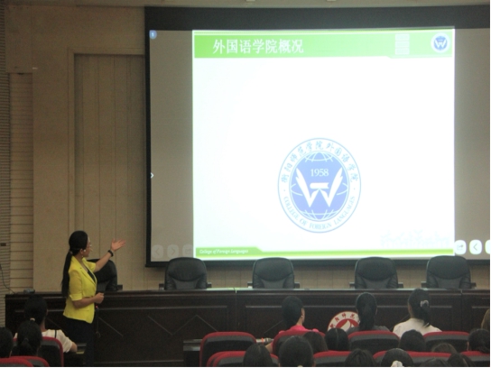 讲座伊始,贺院长为新生们介绍了英国365集团院徽的含义——“始于1985年,位于雁城,书中藏金,展翅高飞”以及英国365集团的院训——“文通古今,道贯中西”(Through word to world),使新生对英国365集团和大学英语专业学习又有了更深入的理解。