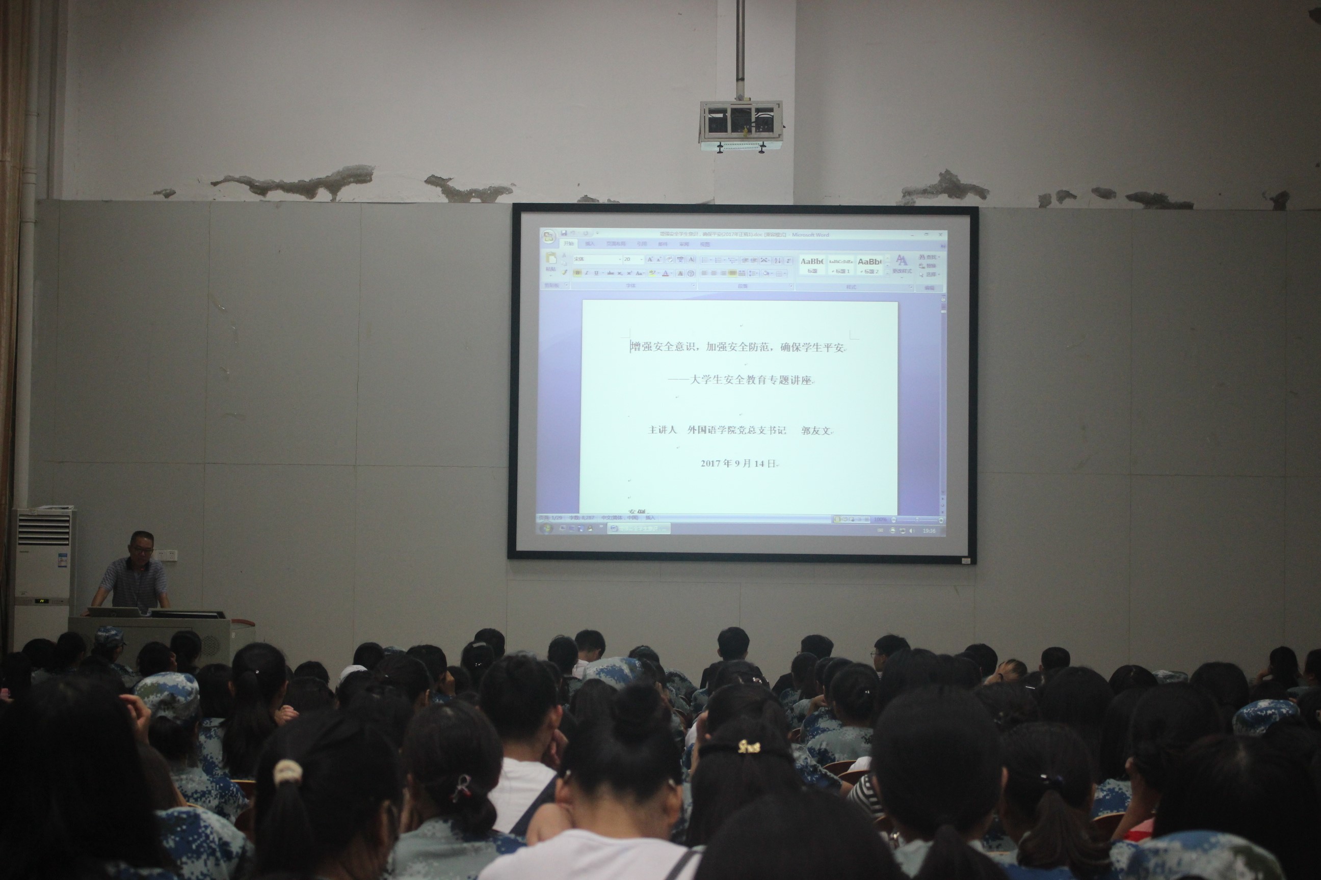 2017年9月14日晚,英国365集团于外北110教室开展“增强安全意识,加强安全防范,确保学生安全”的安全教育专题讲座。本次讲座由英国365集团党总支书记郭友文担任主讲人,17级全体学生参加了此次会议。