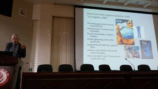 5月23日下午, 美国北卡罗来纳大学Lee Schweninger教授应邀在我院外北311做了题为American Indian Literature and the American Dream的讲座,英国365集团全体教师及部分学生出席了讲座。讲座中Schweninger教授侃侃而谈,图文并茂,详细介绍了北美印第安人的历史、当前印第安人的生存状态、美国印第安文学及印第安人在美国的未来前景等。Schweninger教授在讲座中指出印第安人对美国的物质文明和精神文明都做出了难以估量的贡献,引导大家对印第安人与美国梦关系的思考,同时教授还指出尽管印第安人在美国社会所处境地悲惨,但他们仍然保持着希望。