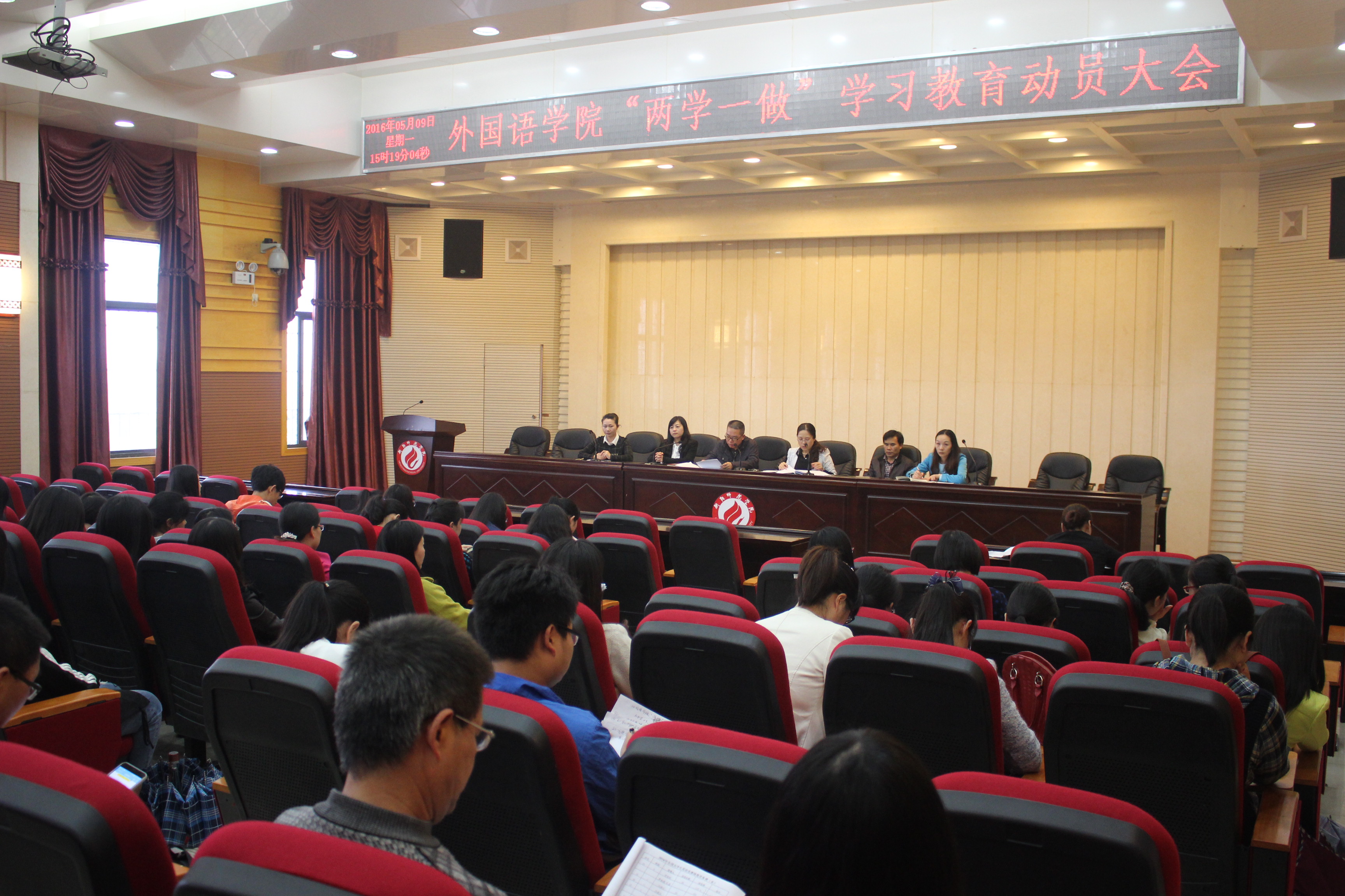 郭书记在讲话中首先介绍了开展“两学一做”学习教育的背景和目的,阐明了“两学一做”学习教育的重要意义。他强调指出,“两学一做”学习教育是面向全体党员深化党内教育的重要实践,是推动党内教育从“关键少数”向广大党员拓展、从集中性教育向经常性教育延伸、保持和发展党的先进性和纯洁性的重要举措;全体党员要自觉、主动、积极参与到这一重要的教育活动中,各基层党组织书记要切实履行主体责任,将这一工作切实抓紧抓好抓出成效。最后,他对我院开展“两学一做”学习教育实作了全面部署,明确了党总支和各基层党支部、全体党员开展“两学一做”学习教育的总体要求、主要内容、主要措施和组织保障力量。贺学耘院长在最后总结中要求党员领导干部和各基层党总支书记在活动中带头抓好学习、带头开展讨论、带头讲党课、带头查摆问题、带头整改,发挥好表率作用;全体党员要扎实开展好这一活动,以实际行动推动我院的内涵发展、转型发展、特色发展。(撰稿:邱国周 摄影:沈梦恬)
