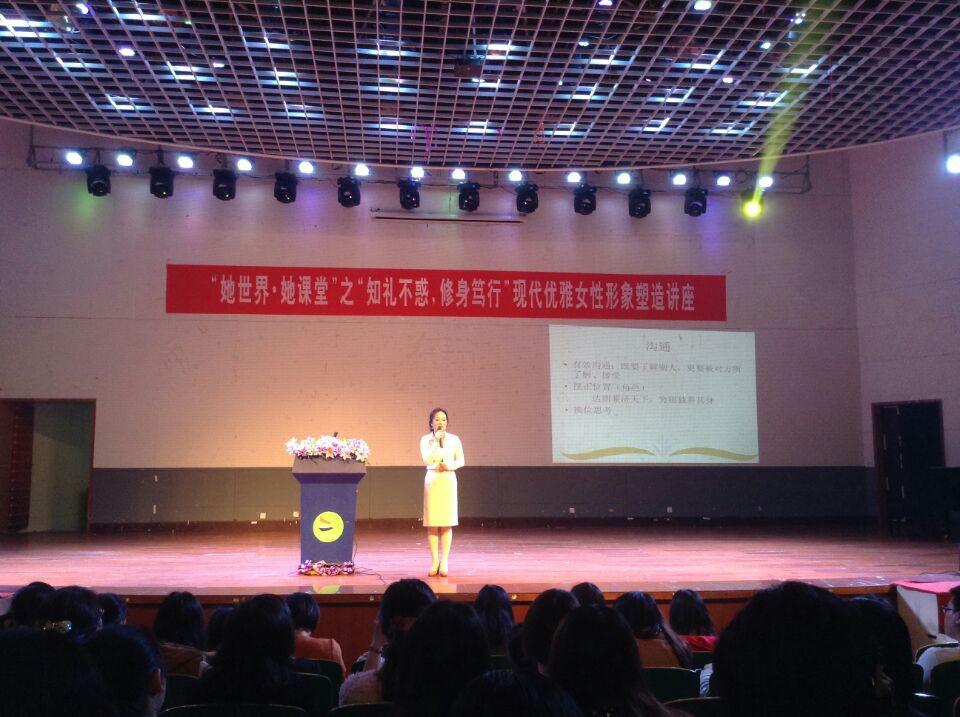 4月10日晚七点,外语系“她世界·她课堂”之“知礼不惑·修身笃行”现代女性形象塑造讲座在东校区音乐厅举行。讲座邀请了姃雅文化传播有限责任公司董事长仇健女士。出席本次讲座的还有外语系党总支书记郭友文、外语系党总支副书记何芳,辅导员封伟为、张倩及外语系学生。