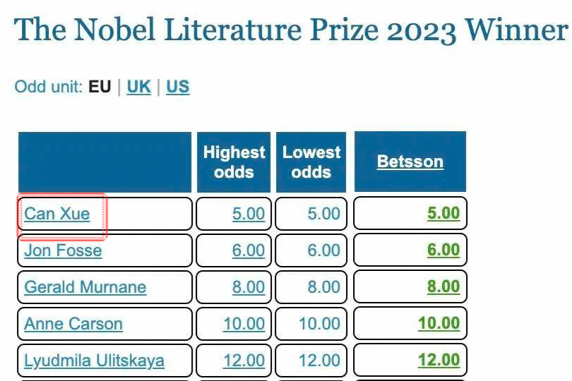 (图为2023年诺贝尔文学奖NicerOdds赔率榜欧盟版前五名,今年已是残雪连续第四年成为最有潜力获奖的提名者)