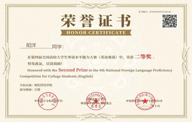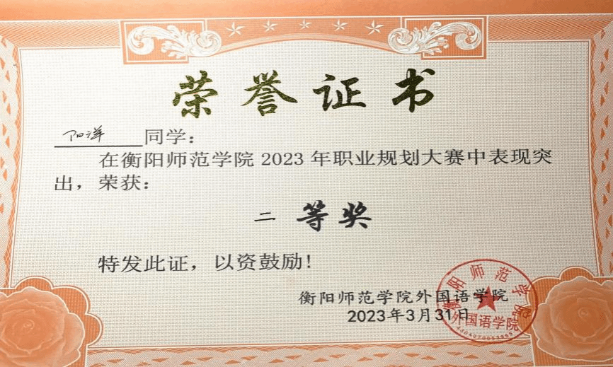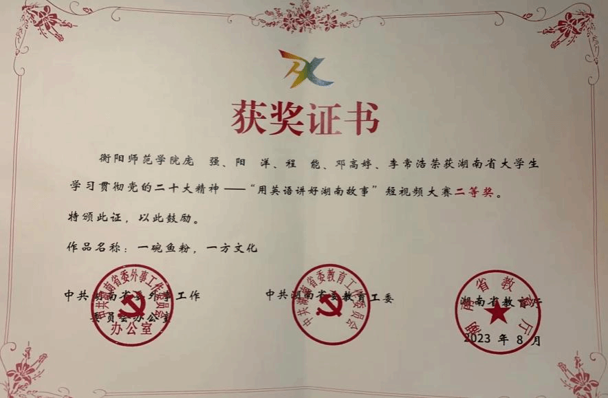 2023年省级“用英语讲好湖南故事”短视频大赛二等奖、校级特等奖;