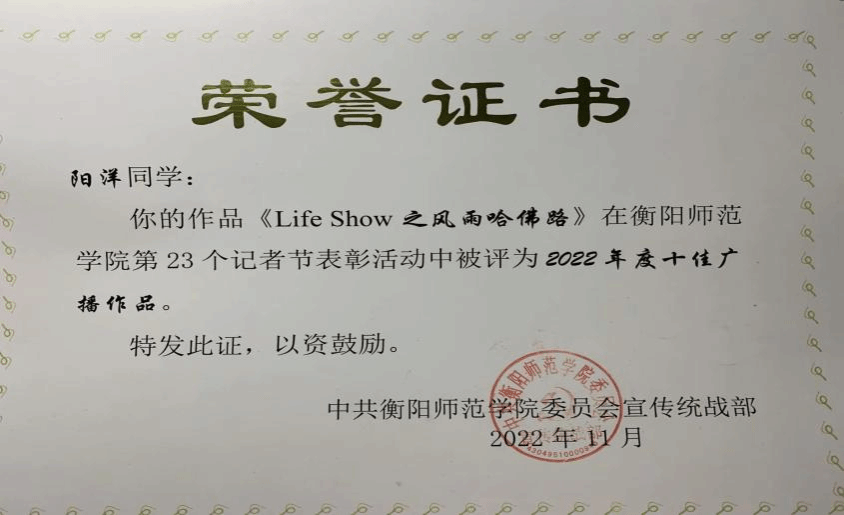 2022-2023任校宣统部校园之声广播站英播员与lifeshow节目监制;