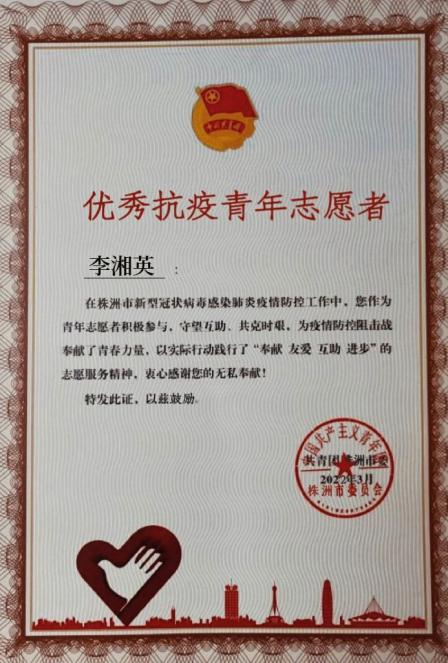 于2022年被株洲市共青团市委评选为“优秀抗疫青年志愿者”;