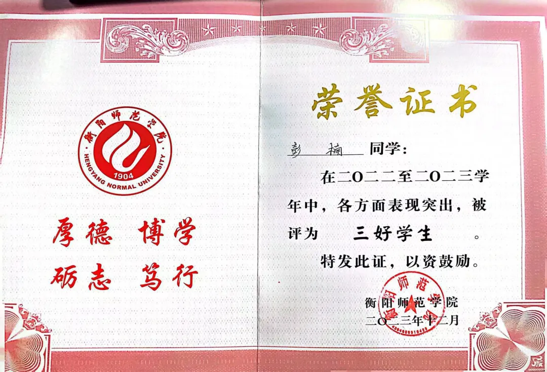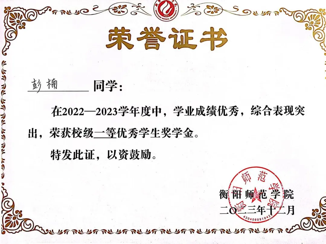 2023年12月荣获2022-2023年校一等奖学金以及“三好学生”称号
