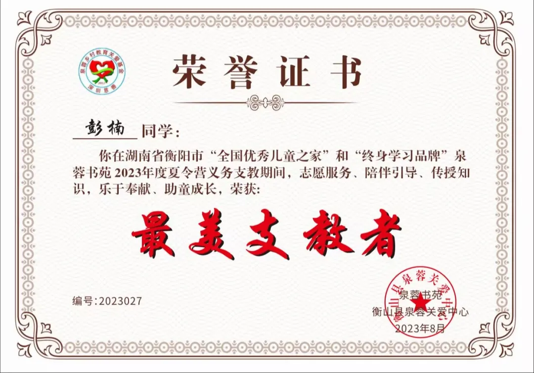 2023年8月荣获衡山县关爱中心“最美支教者”称号
