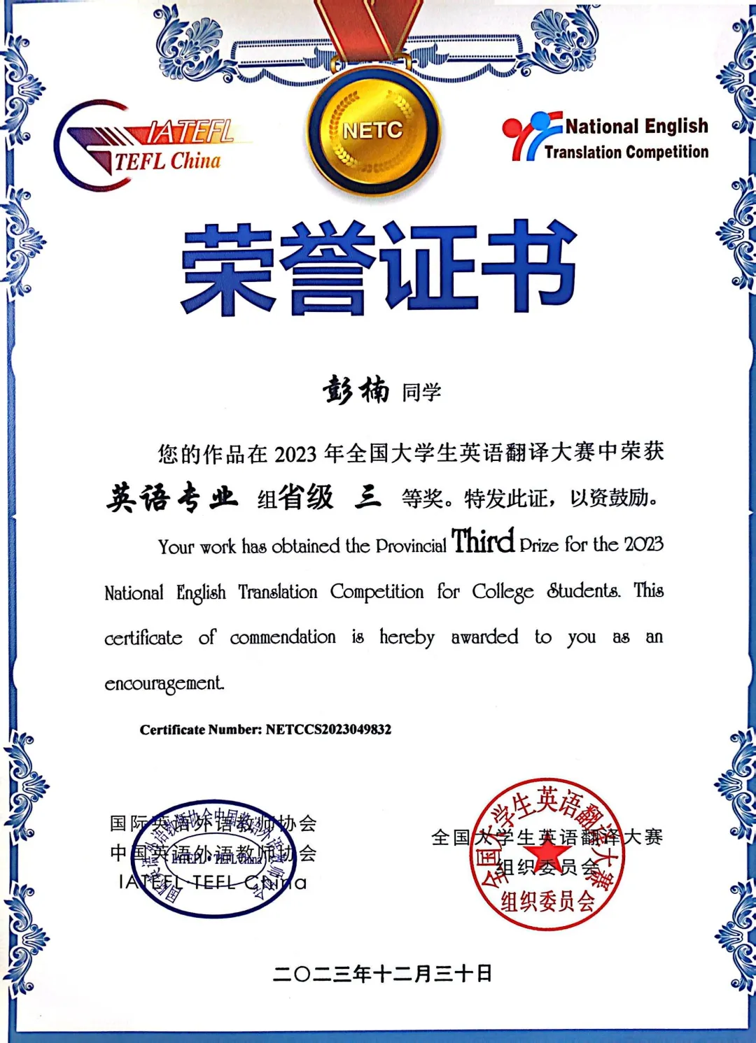 2023年12月荣获全国大学生翻译大赛“省级三等奖”
