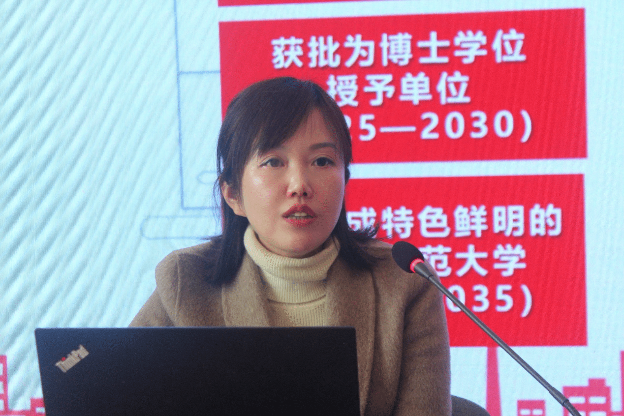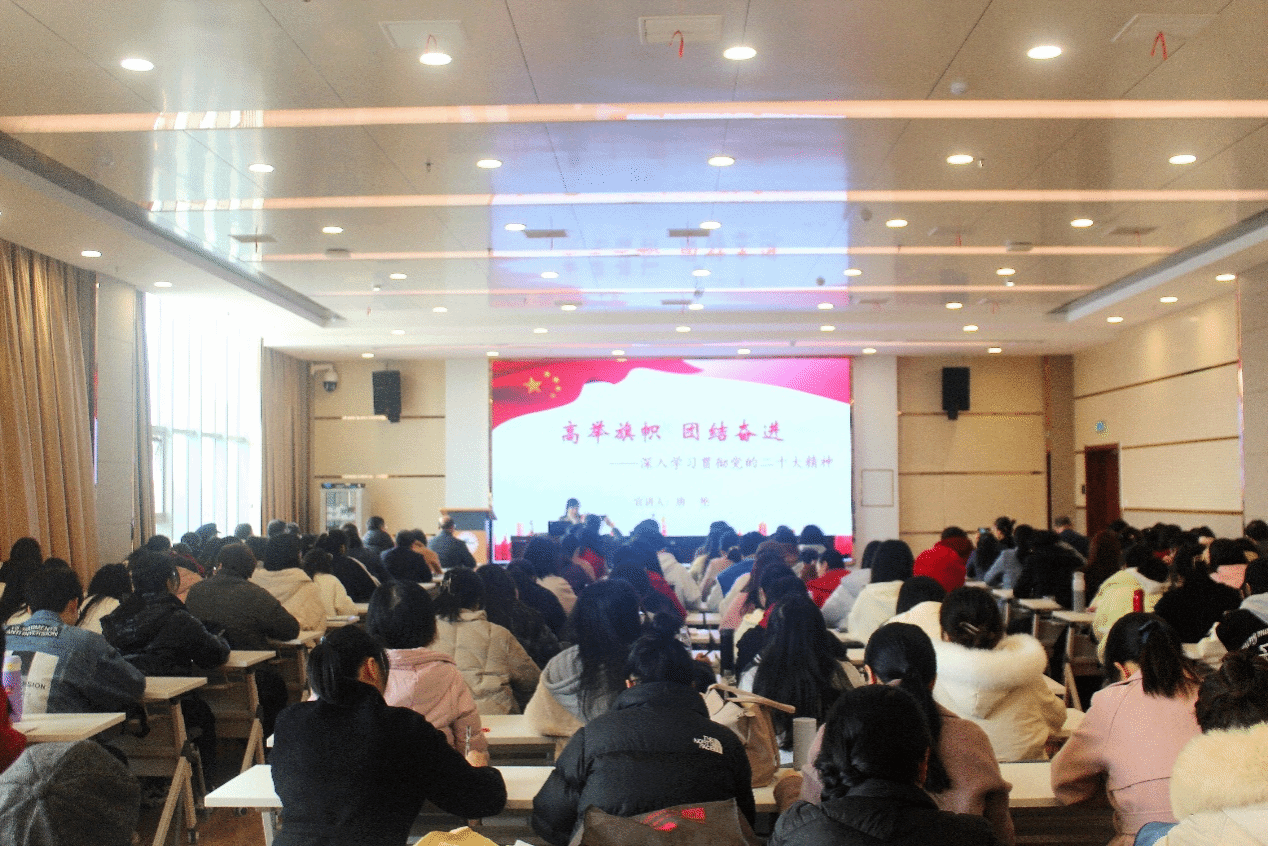 唐艳以《高举旗帜,团结奋进——深入学习贯彻党的二十大精神》为题,分“我在何方——迈上新征程,冲锋号角已经吹响”“使命何在——肩负新使命,宏伟蓝图已绘就”和“我当何为——展现新作为,书写奋进之笔”三大部分内容进行阐述。