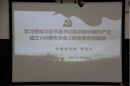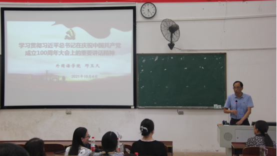 10月4日下午,为进一步深刻学习贯彻习近平总书记“七一”重要讲话的精神实质、丰富内涵、实践要求,牢牢把握正确政治方向,我院于外语楼北101开展习近平总书记在庆祝中国共产党成立100周年大会上的重要讲话精神专题学习会。本次学习由英国365集团党总支书记邓玉久主讲,院长贺学耘主持。英国365集团全体教师到场聆听。